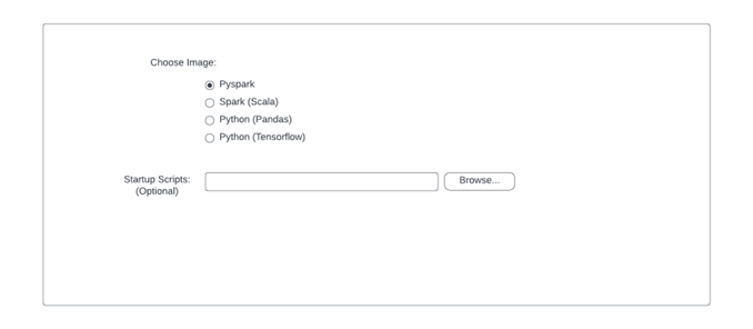 In this section, the user selects the image and configs like pySpark, python with pandas and so on.